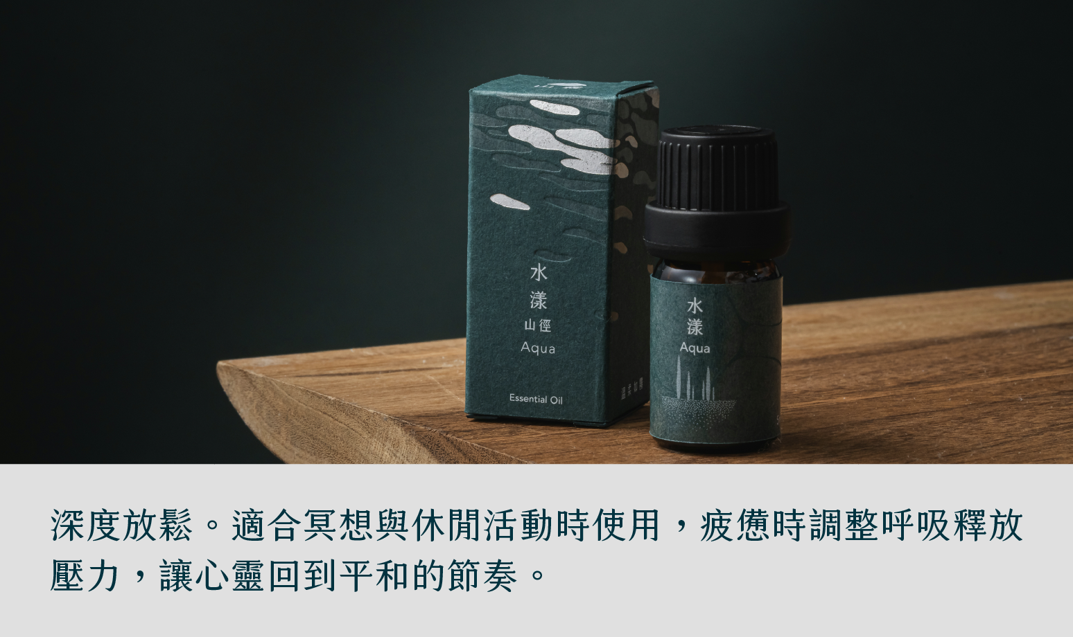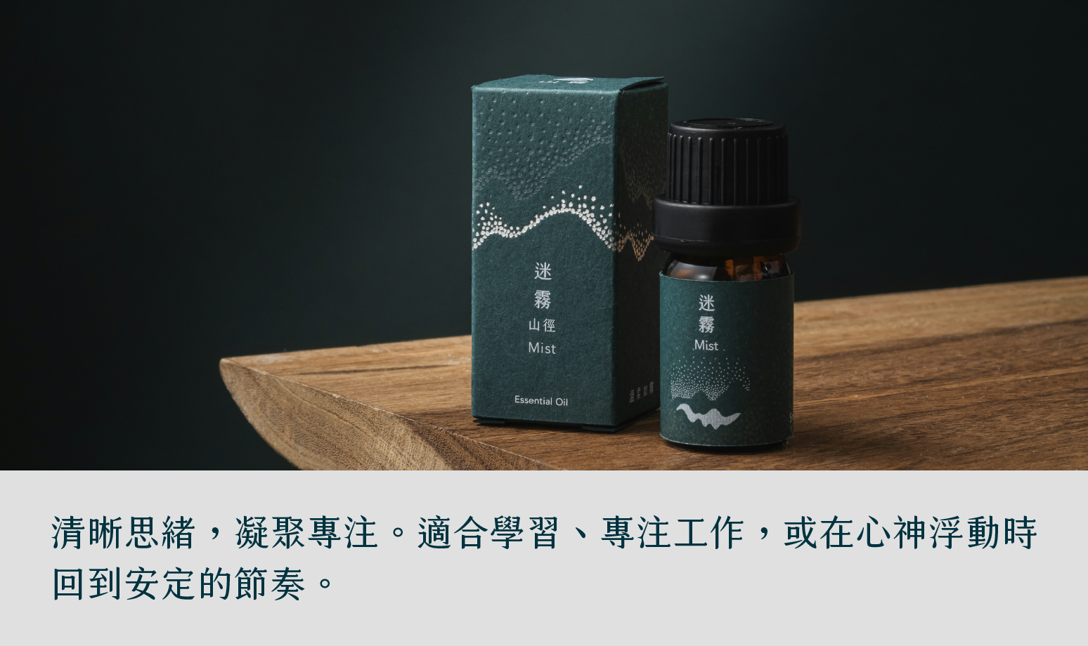 以阿里山的海拔變化為靈感,設計出高海拔迷霧(專注)、中海拔眠月(舒眠&寵物友善)、低海拔水漾(放鬆),三款山林系天然複方精油。