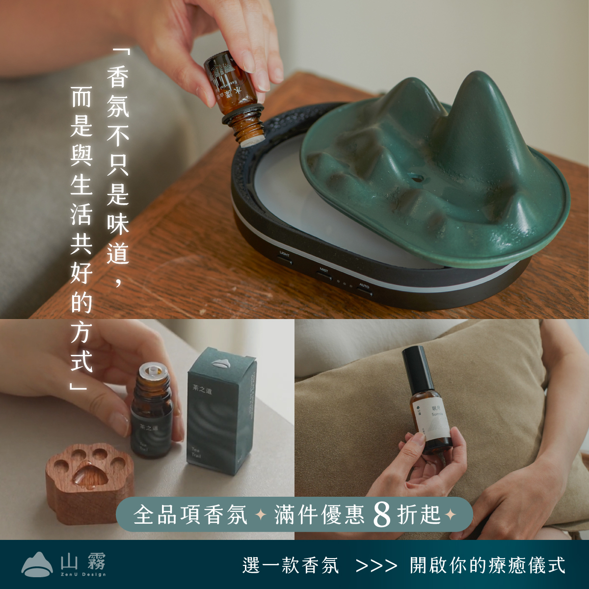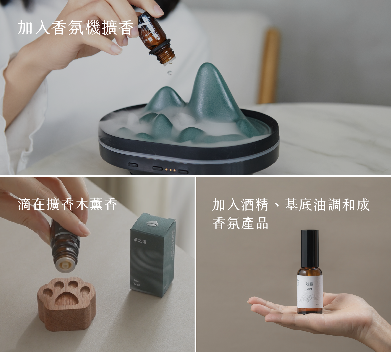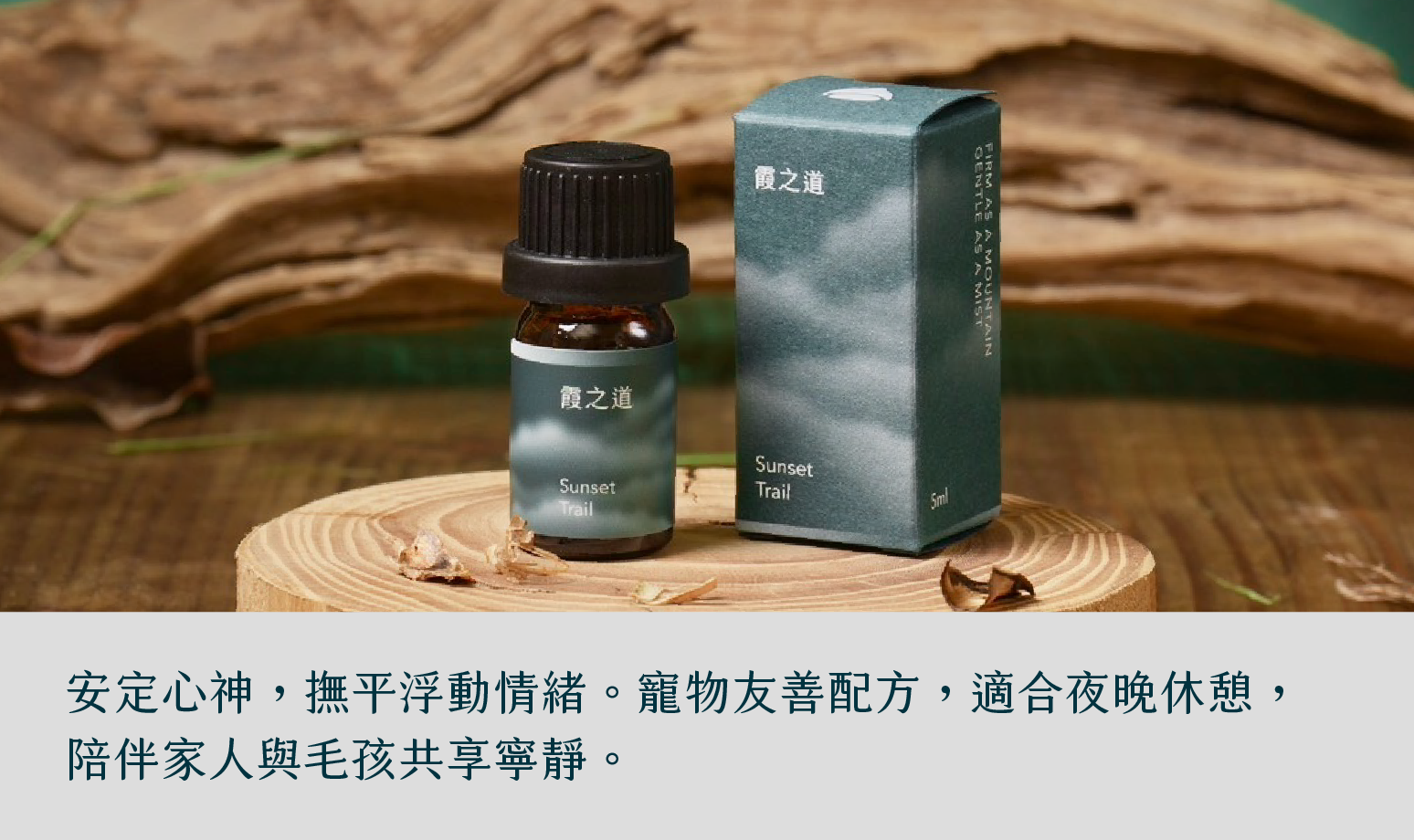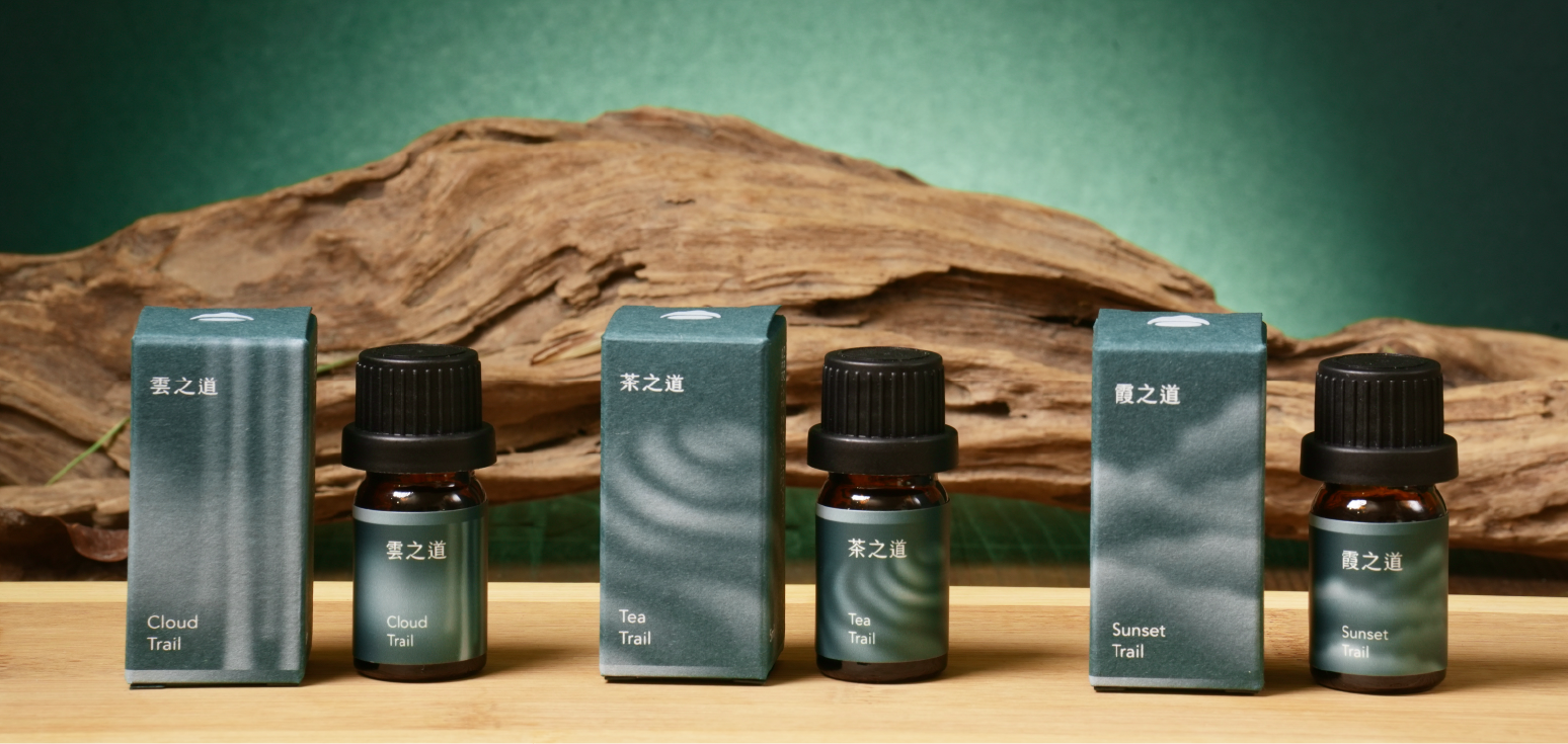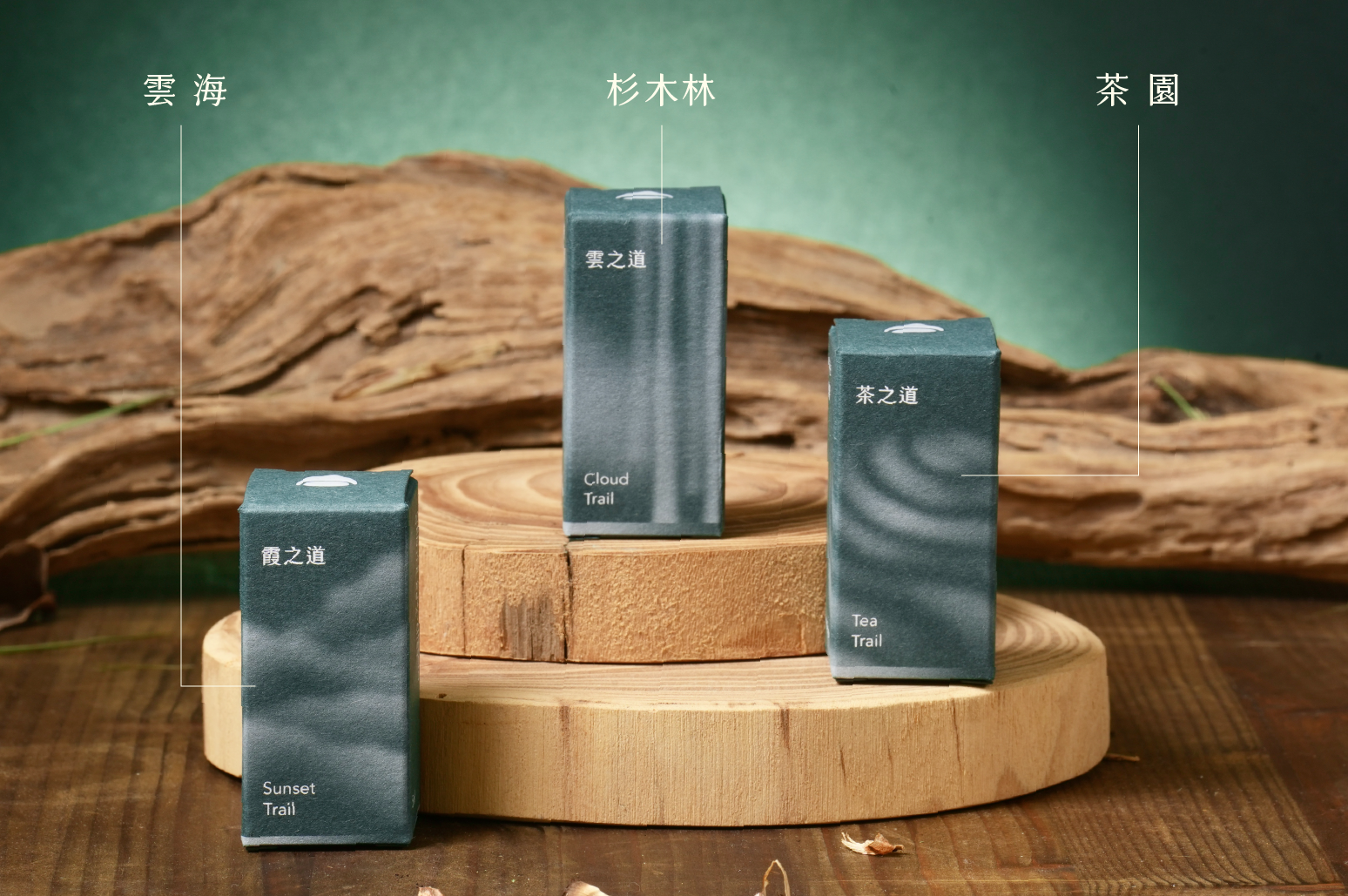 以阿里山頂石棹步道一天的時序變化為靈感,設計出早晨雲之道(放鬆)、午後茶之道(專注)、黃昏霞之道(安定心神&寵物友善),三款山林系天然複方精油。