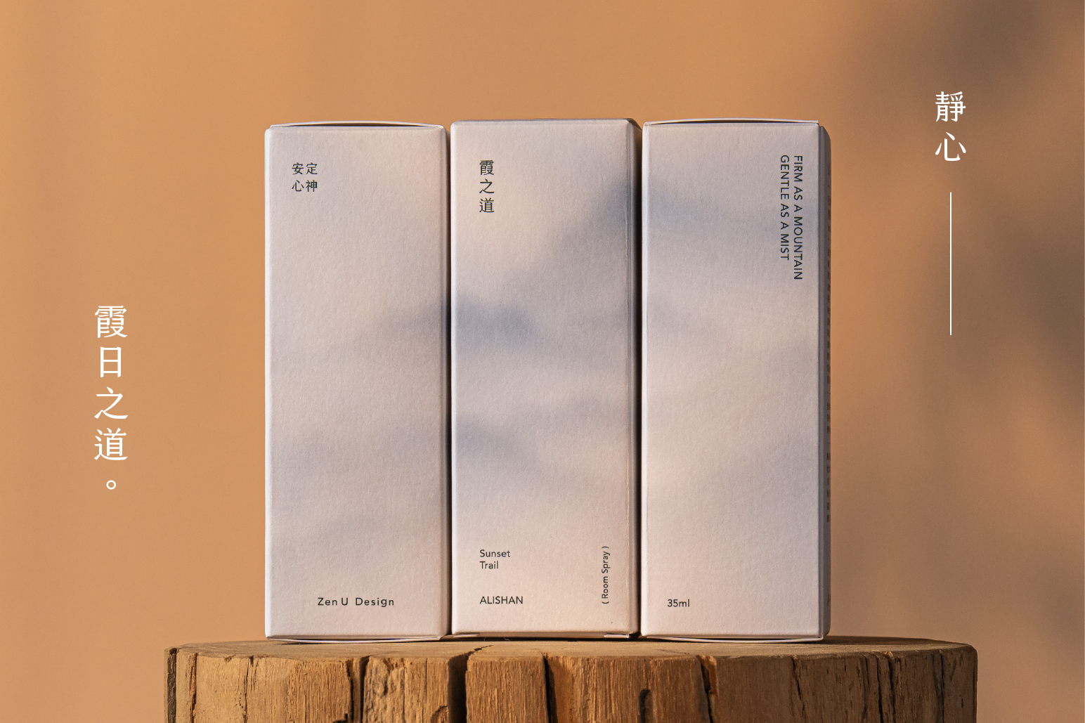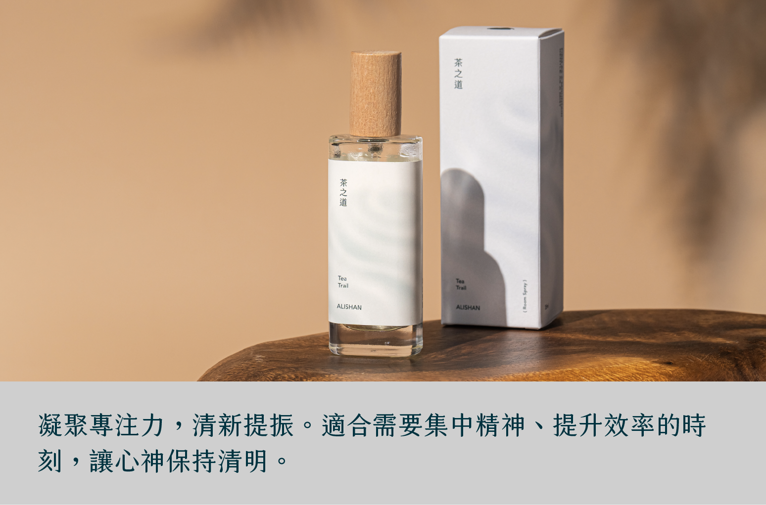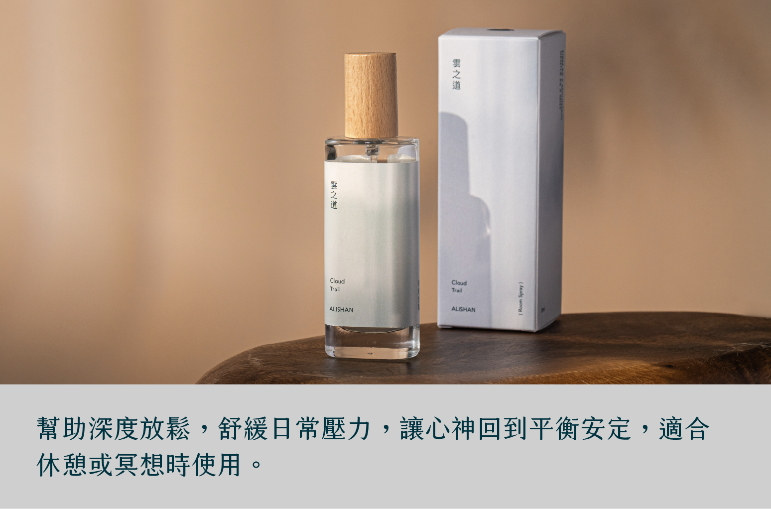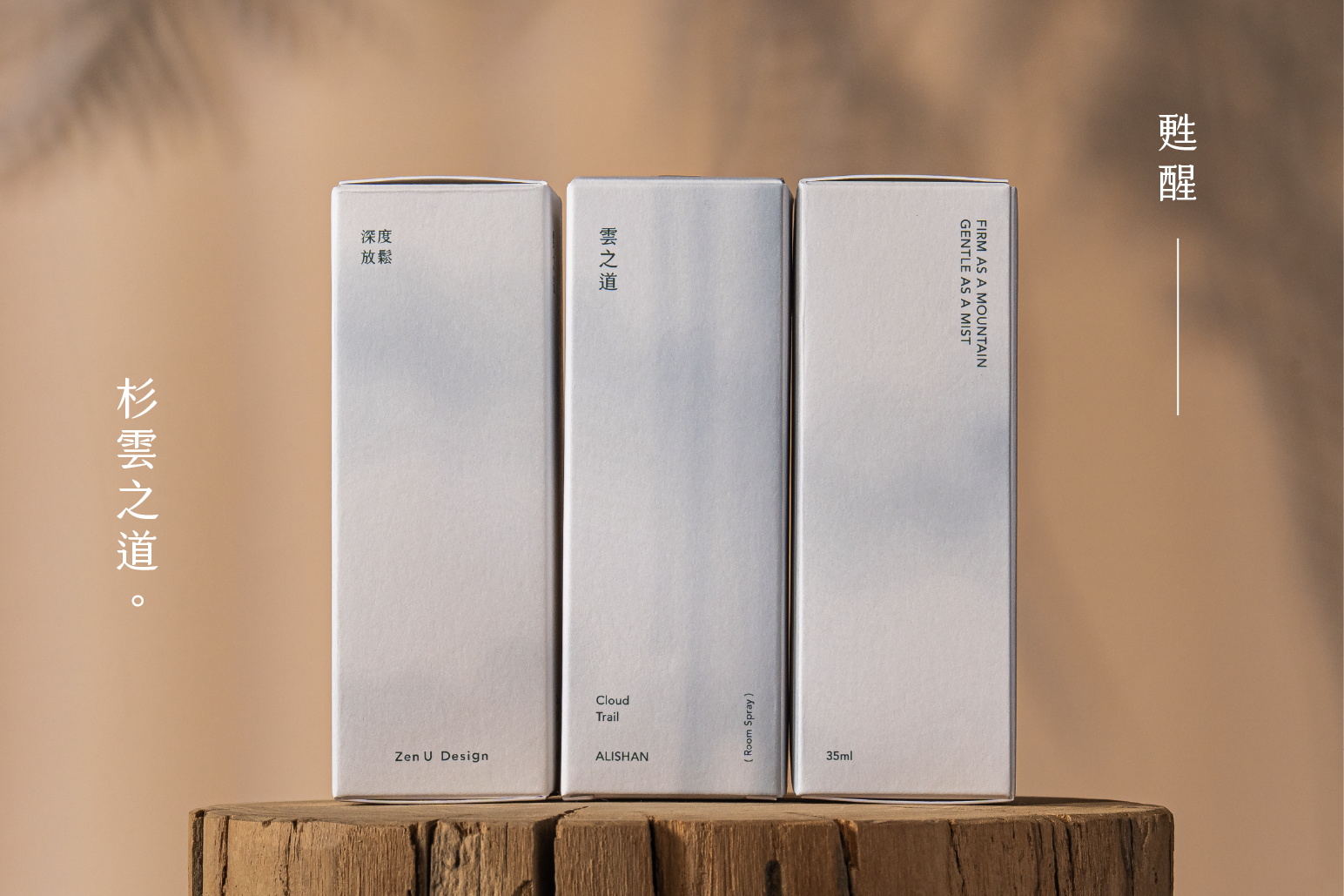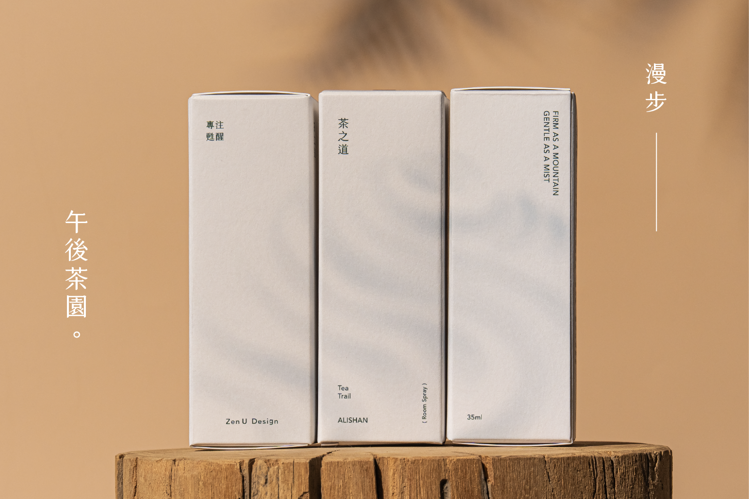 以阿里山頂石棹步道一天的時序變化為靈感,設計出早晨雲之道(放鬆)、午後茶之道(專注)、黃昏霞之道(安定心神&寵物友善),三款山林系天然複方香氣。