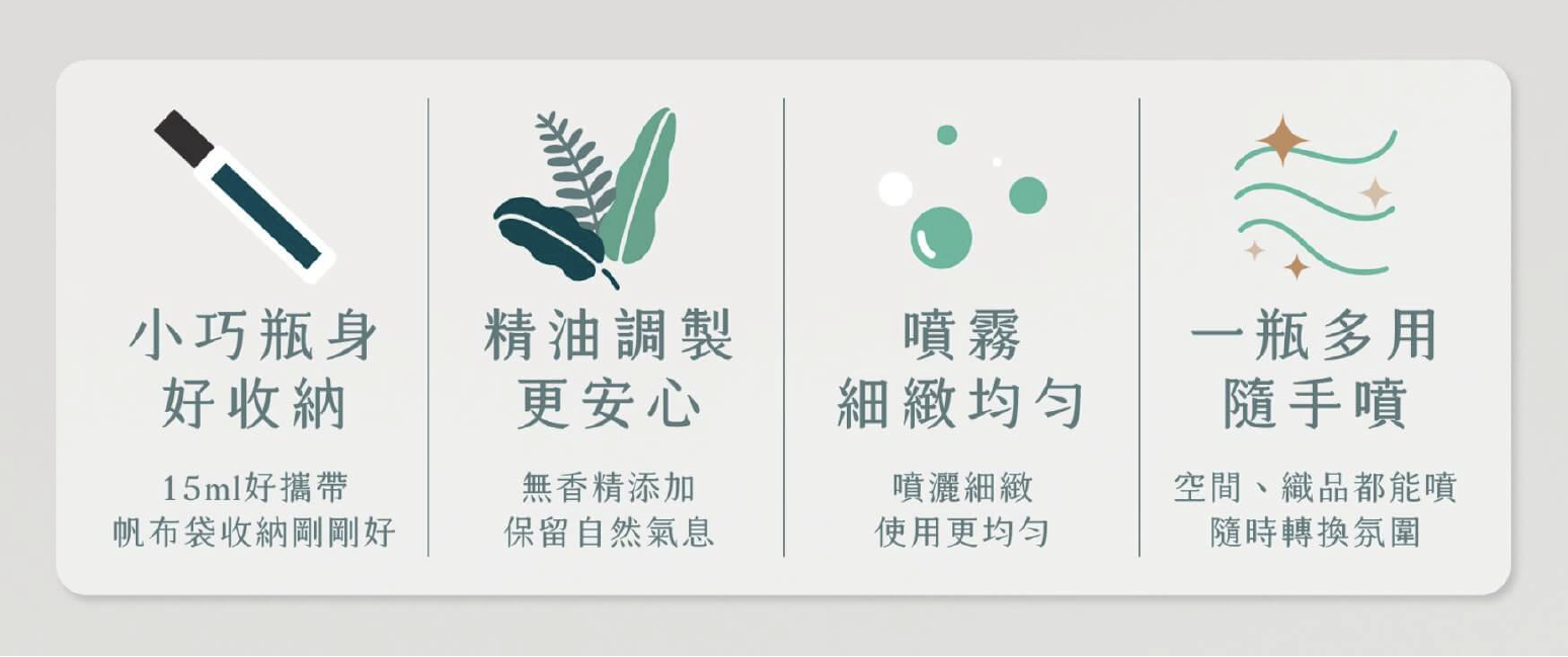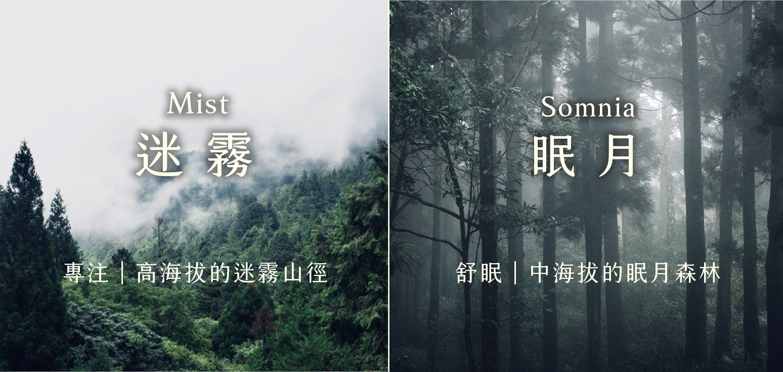 以阿里山的海拔變化為靈感,設計出高海拔迷霧(專注)與中海拔眠月(舒眠&寵物友善)的山林系天然複方香氣。