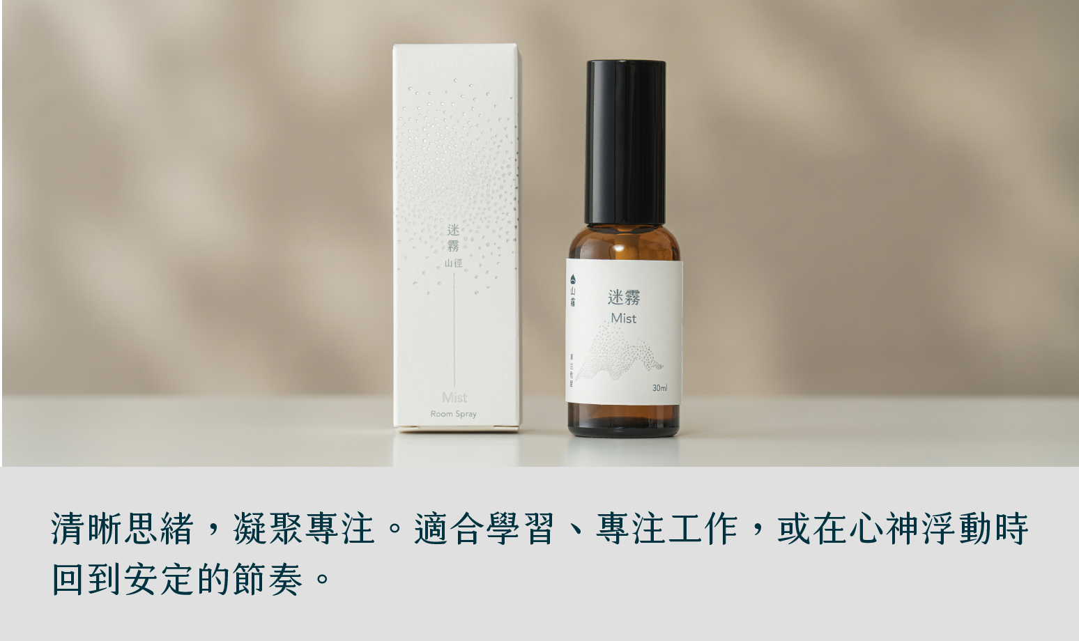 以阿里山的海拔變化為靈感,設計出高海拔迷霧(專注)、中海拔眠月(舒眠&寵物友善)、低海拔水漾(放鬆),三款山林系天然複方香氣。
