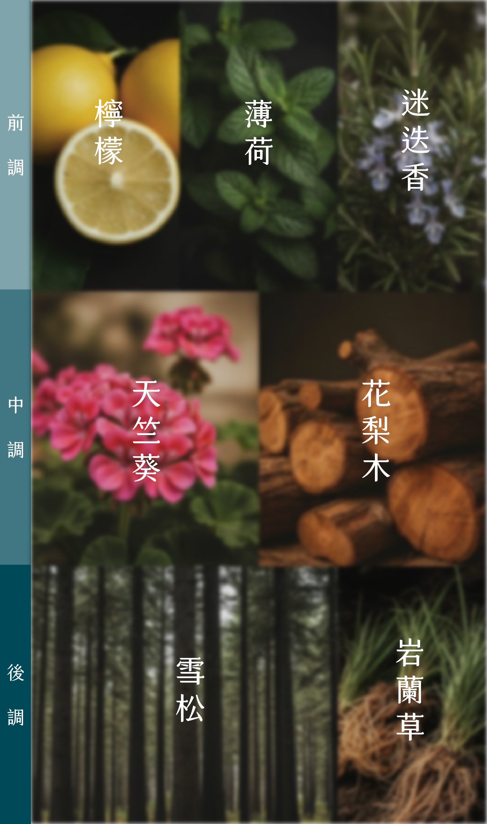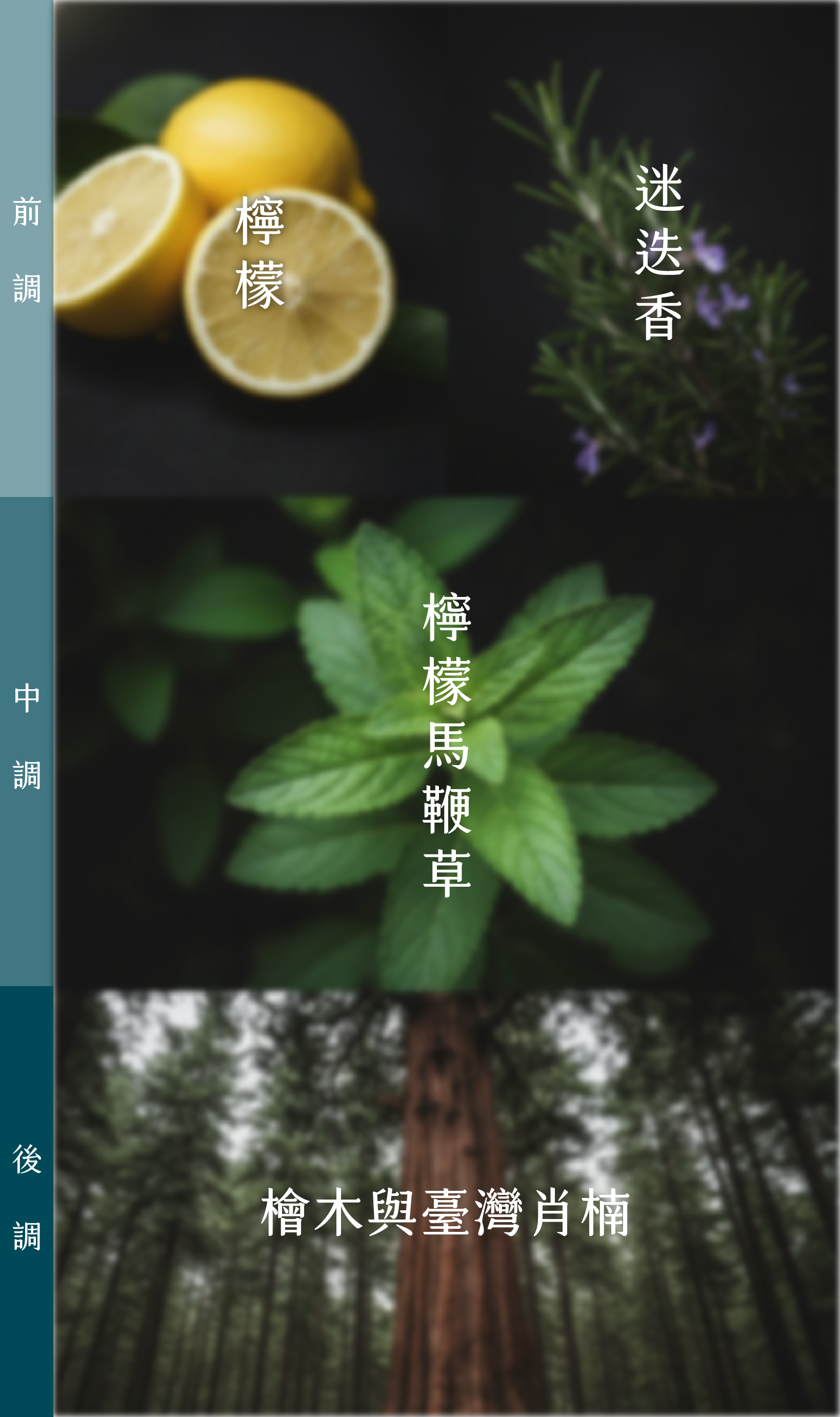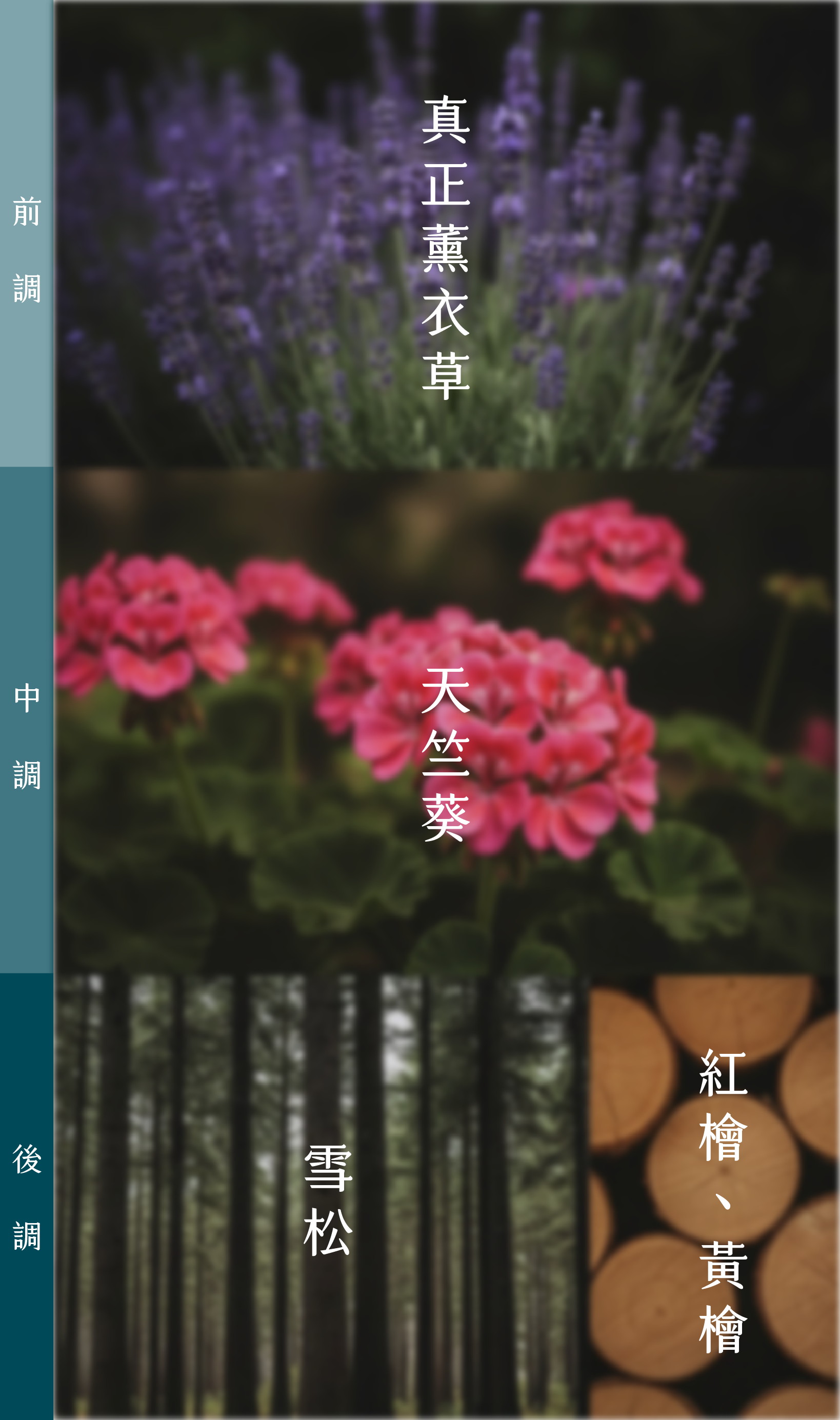 以阿里山的森林時序為靈感,設計出早晨雲之道(放鬆)、午後茶之道(專注)、黃昏霞之道(安定心神&寵物友善),三款山林系天然複方精油。